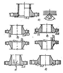 а — гладкая с рисками, б — выступ-впадина, в — шип-паз, г — под линзовую прокладку, д — под кольцевую прокладку овального сечения